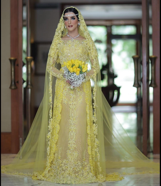 Awalnya Tasya Farasya memakai pakaian dengan veil berwarna kuning semua seperti ini. Namun desainnya lebih glamor dengan dominasi brokat. Ternyata bukan cuma Tasya Farasya yang menggelar pernikahan dengan mewah karena sang kembaran Tasyi Athasyia juga menggelar pesta mewah saat menikah dengan Syech Zaki.