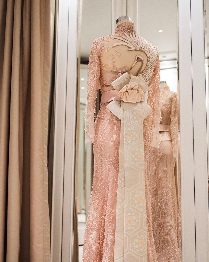 Dilihat dari dekat gaun Syahrini tampak sangat indah. 352019 Pernikahan Syahrini Makna Simbol Bangau di Gaun Syahrini Saat Lamaran Perpaduan Kebaya dan Kimono Dalam video yang diunggah Syahrini tampil sangat cantik dengan gaun berwarna peach yang membalut. Kalau baju itu ibu mertua yang mengatur.